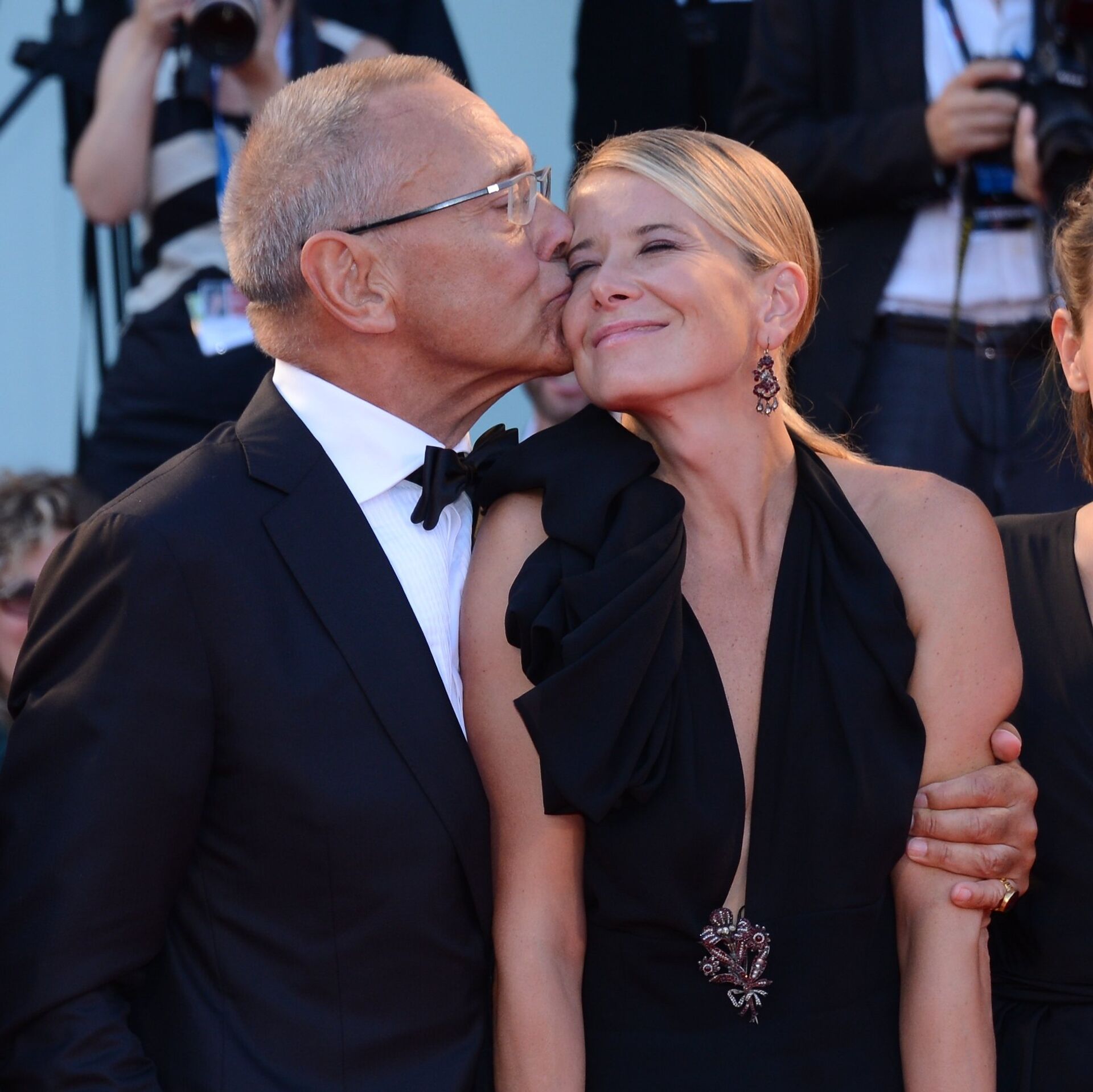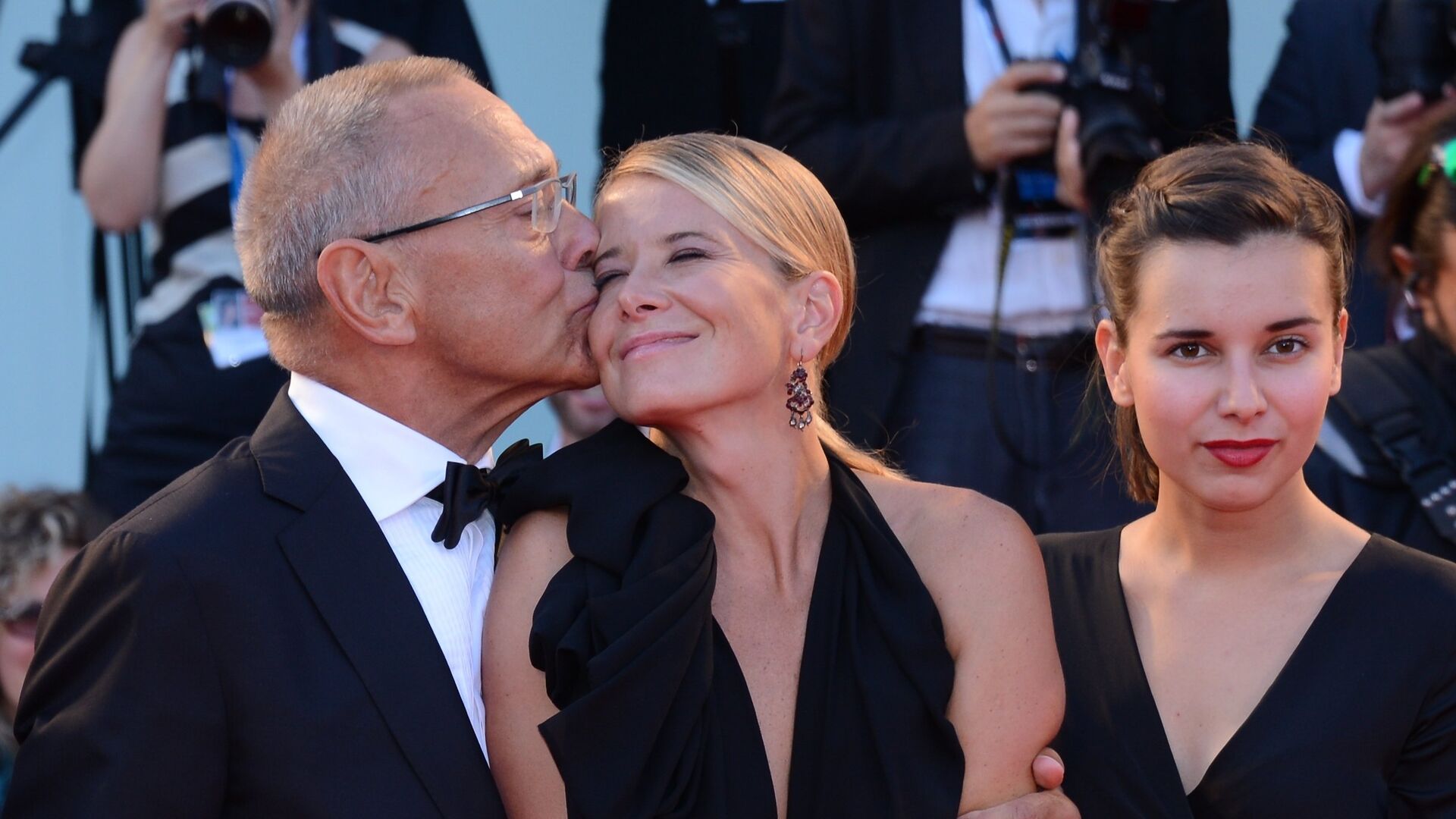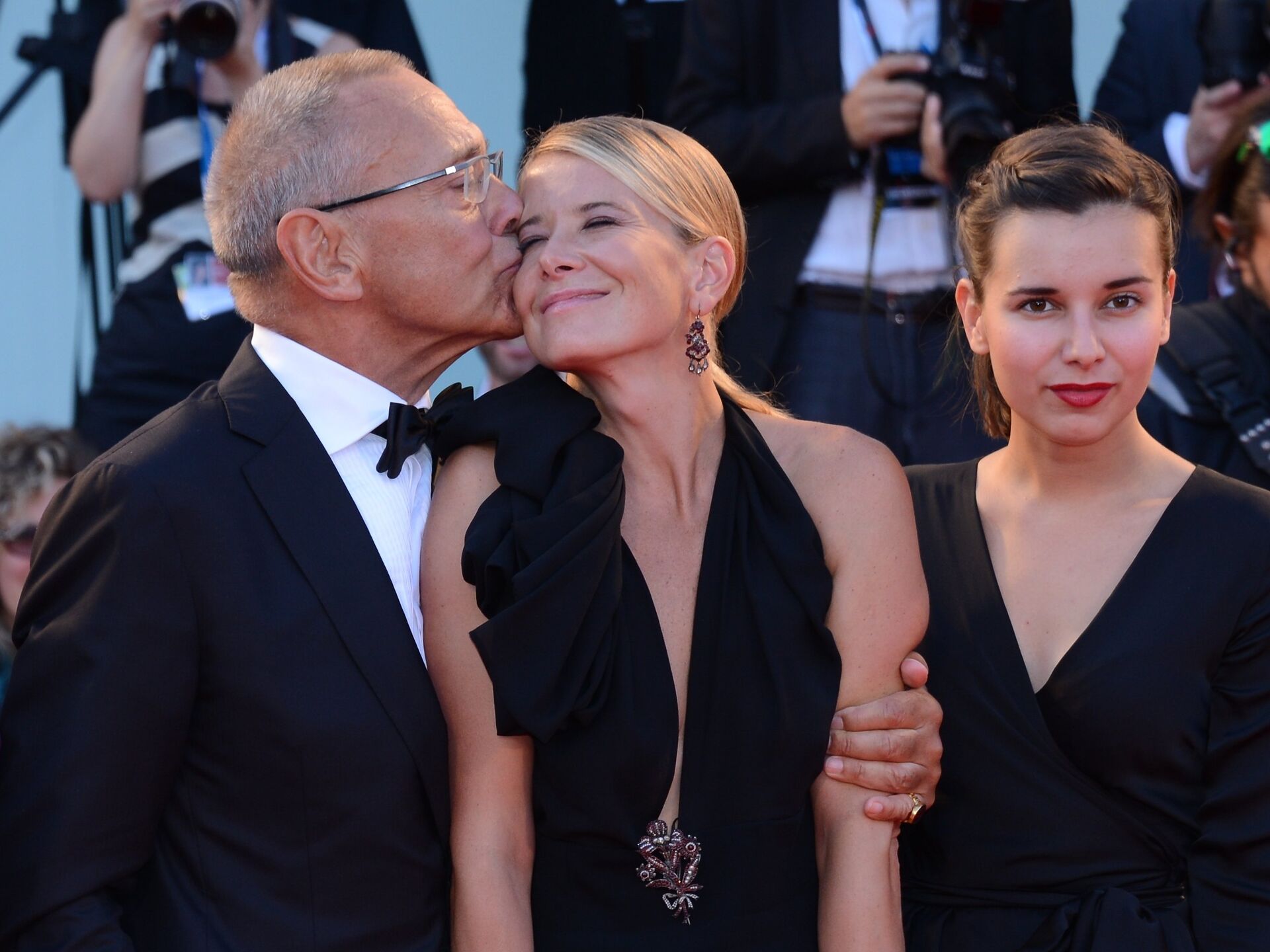 На фото: Российский режиссер Андрей Кончаловский с супругой актрисой Юлией Высоцкой и дочерью Еленой Кончаловской (слева направо) на церемонии закрытия 71-го Венецианского международного кинофестиваля.