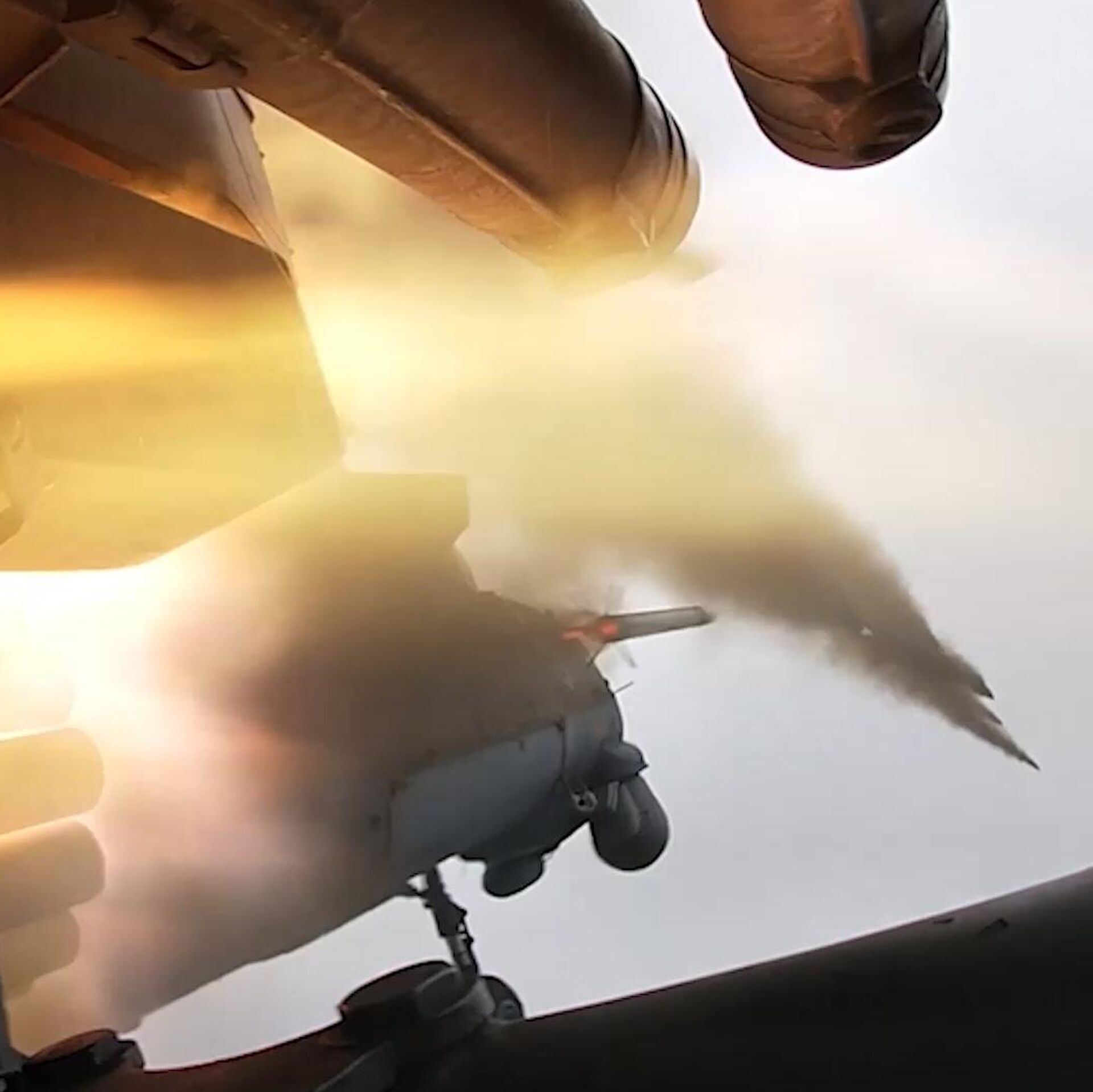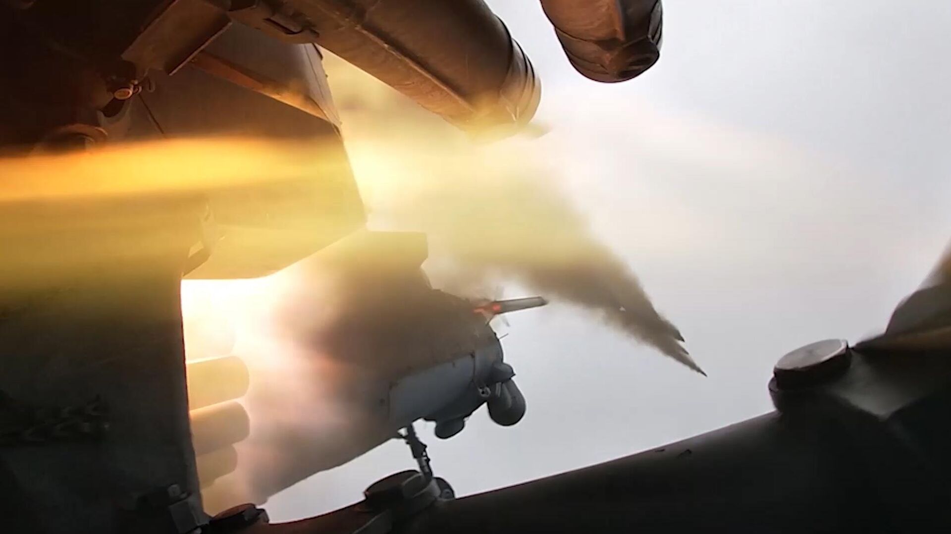 Кроме того, ведомство опубликовало видеоролик, в котором показано, как ракеты загружаются пусковую установку на подвесе вертолёта. Также демонстрируются полёт винтокрылой машины и нанесение удара. Можно видеть, куда попадают ракеты из залпа Ми-35М.