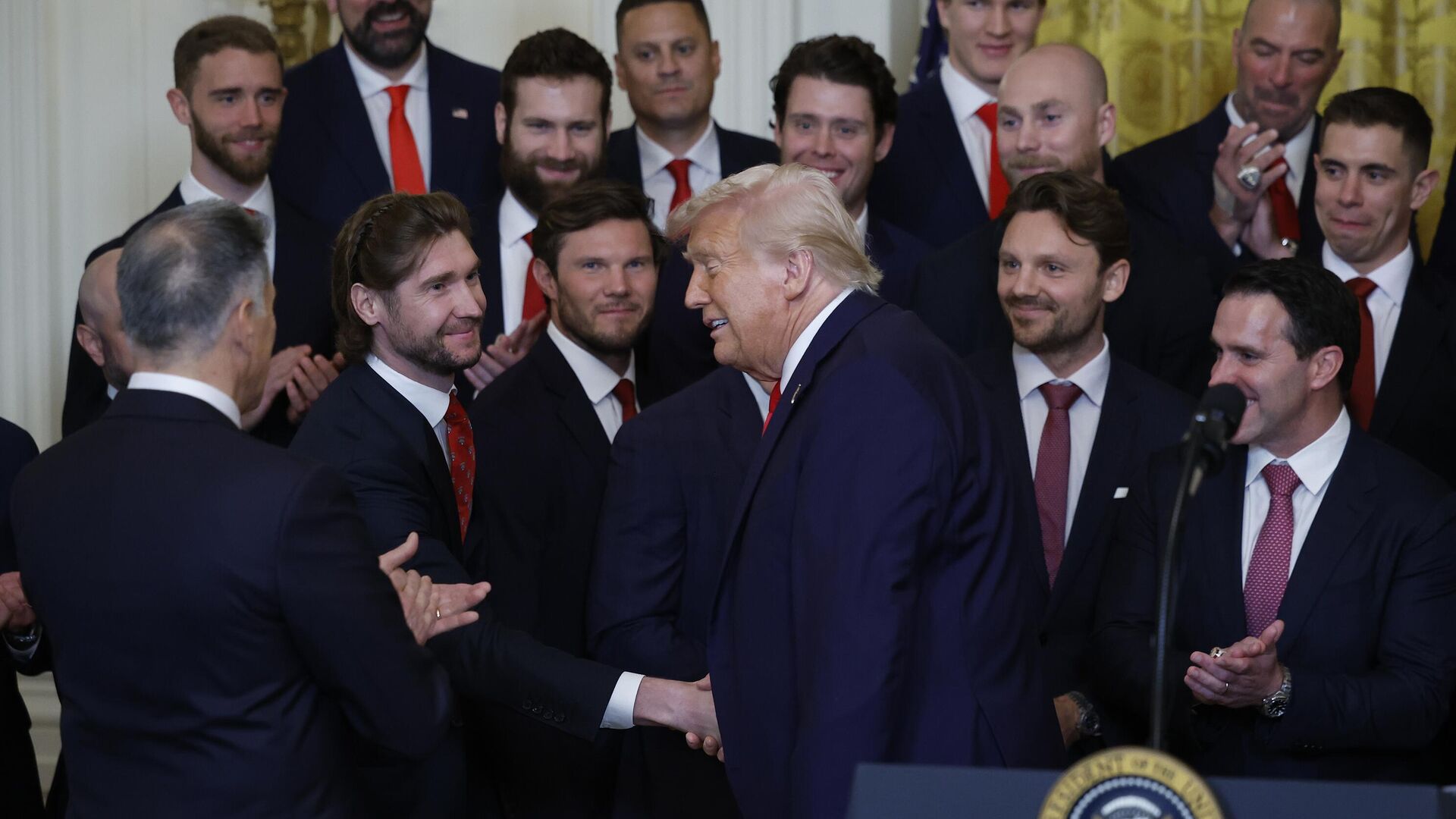 В ходе церемонии президенту США были вручены памятные презенты: золотая клюшка, игровой свитер с номером 47, а также еще один свитер "Пантерз" с номером "45-47", который указывает на то, что Трамп является 45-м и 47-м президентом Штатов. Игроки и хоккеисты "Флориды", что естественно, прибыли на церемонию с именными чемпионскими перстнями, стоимость и ценность каждого из которых зашкаливают, и с самим Кубком Стэнли.
