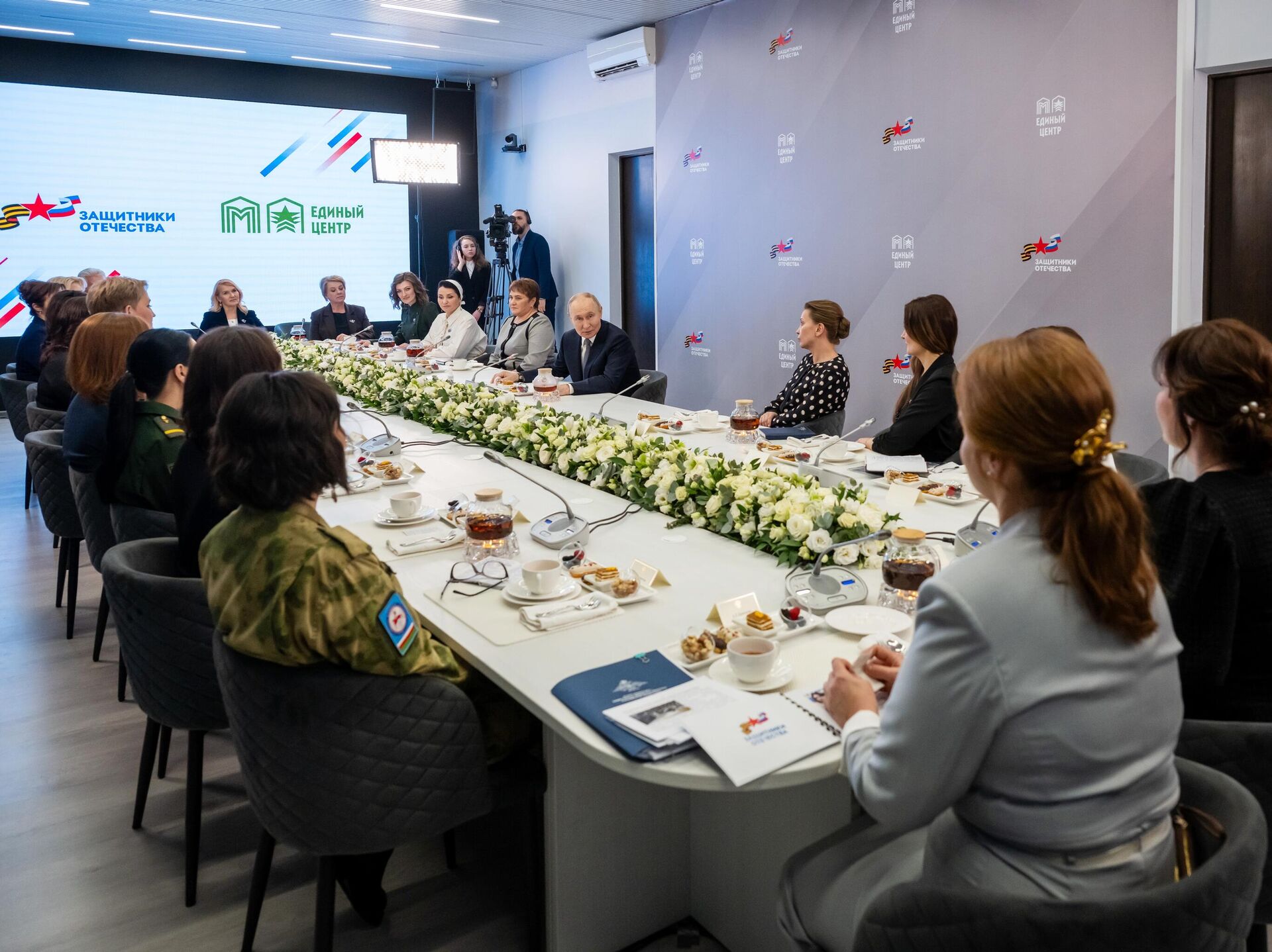 Главу государства сопровождали мэр Москвы Сергей Собянин, статс-секретарь – заместитель Министра обороны, председатель фонда "Защитники Отечества" Анна Цивилева и вдова Героя России Сергея Чебнёва Ольга, с которой президент перед посещением центра провёл отдельную встречу в Кремле. Пояснения также давала руководитель белгородского филиала фонда "Защитники Отечества" Анна Кочерова.
